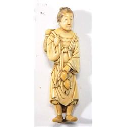 Carved ivory Netsuke modelled as a lady carrying shells in a bag, 9cm high