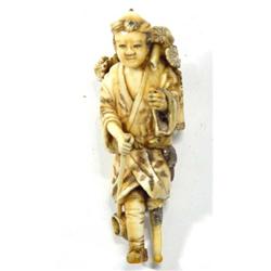 Carved ivory Netsuke modelled as a young man with pegleg carrying a bucket of leaves on his back, 8cm high