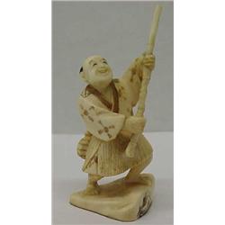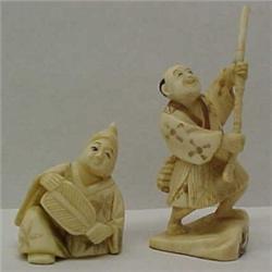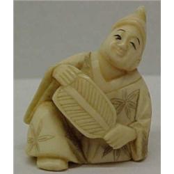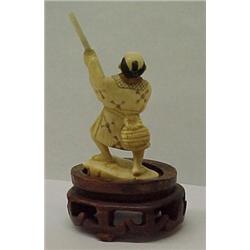 Carved ivory netsuke and figurine, 1 1/2" Netsuke of man with fan; 2" fisherman figurine, end of pole as is, includes carved wooden stand, as is