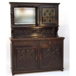 Carved oak sideboard, the super structure with bevelled mirror and a leaded glazed door, the lowe…