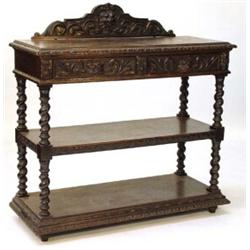 Carved oak three tier buffet with lion mask carved back rail and drawers on barleytwist supports