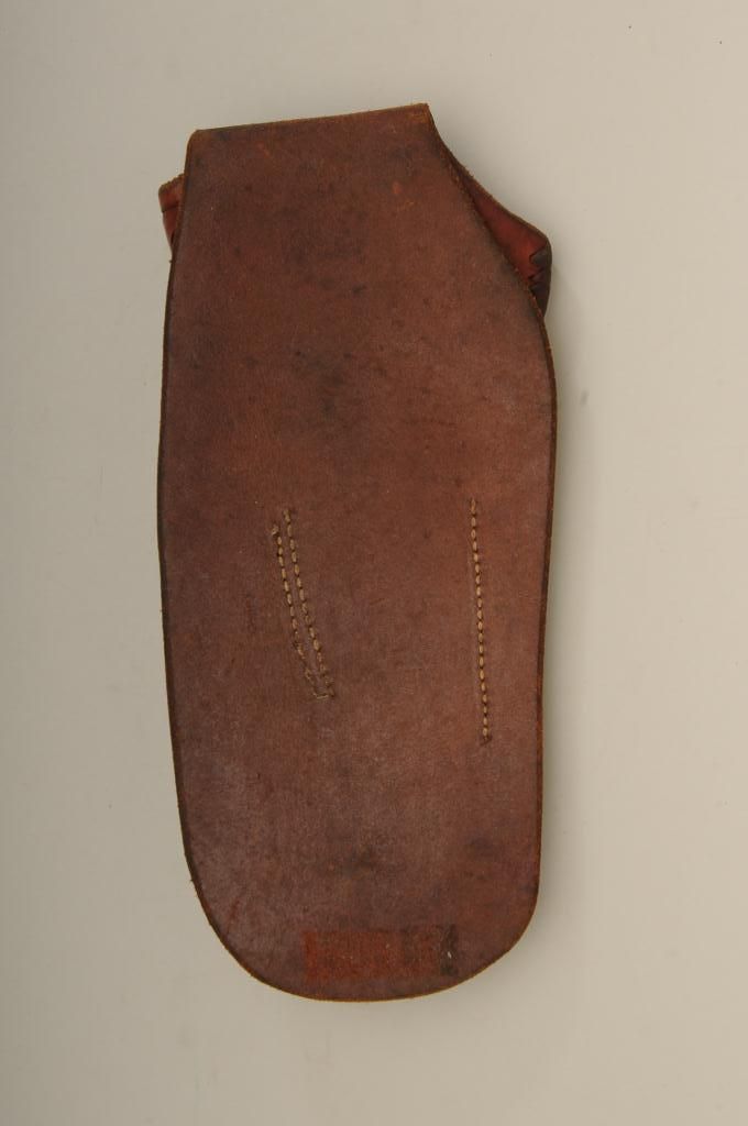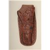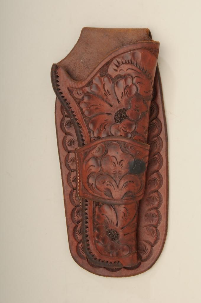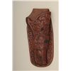 Carved single loop holster in Western style marked Lawrence Portland, Oregon for single action 5 ½” barrel. Shows reinforced edges in very good plus to near fine condition. Est.: $200-$400.