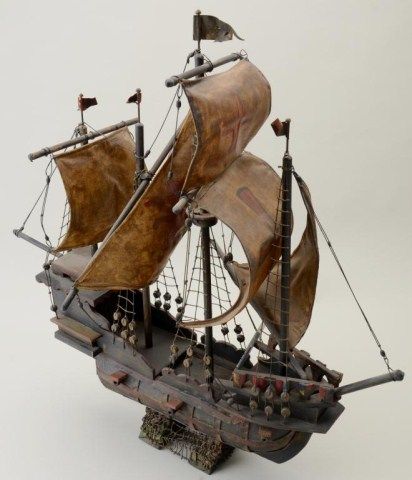 Carved wood Spanish style Galleon, 27” in height, 32” width, appears handmade with leather sails, 50 years old or older. From the estate of Robert Petersen. Est.: $150-$300.
