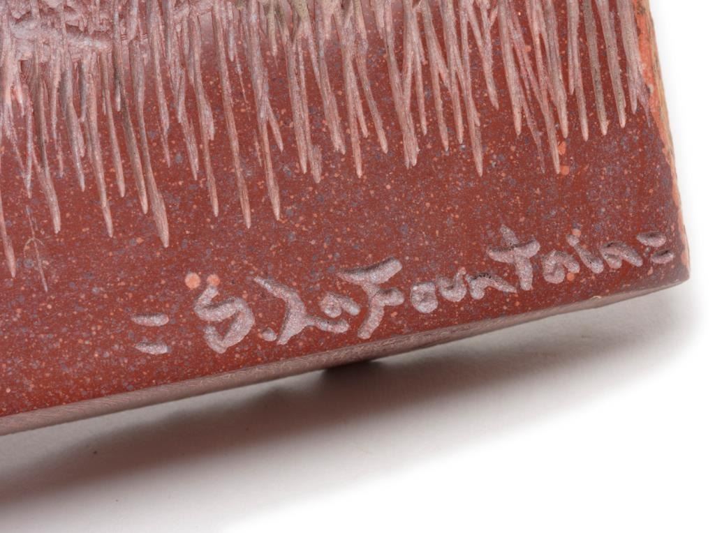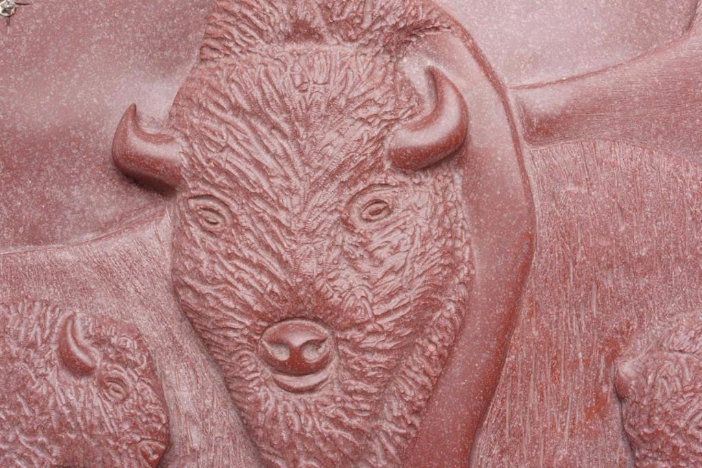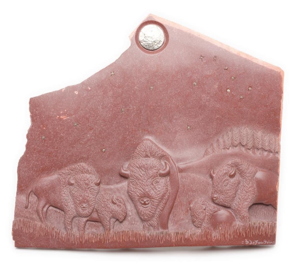 Carving in red pipe stone of buffalos with silver inset of the moon and stars (2006) by S. LeFountain, a noted Santa Fe artist, approximately 19” x 22” overall and beautifully accomplished. Est.:$1,500-$3,000.