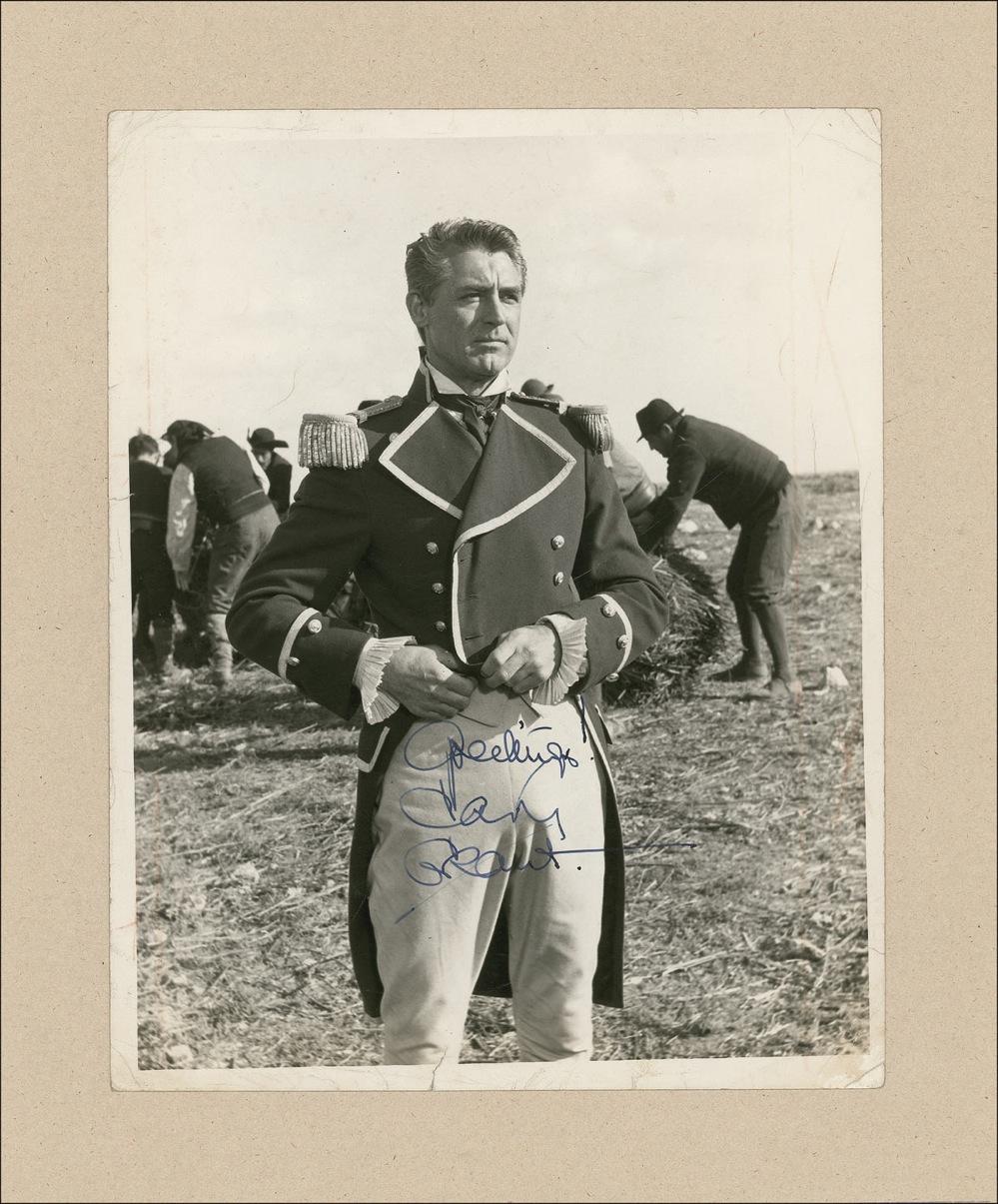 Vintage glossy photo of Cary Grant from ''The Pride and the Passion,'' signed in fountain pen, ''Greetings, Cary Grant.'' 8'' x 10'' photo is affixed by its top edge to a 10.5'' x 12.5'' piece of heavy cardstock. In very good condition, with scattered creases and surface marks, heavier at the edges.