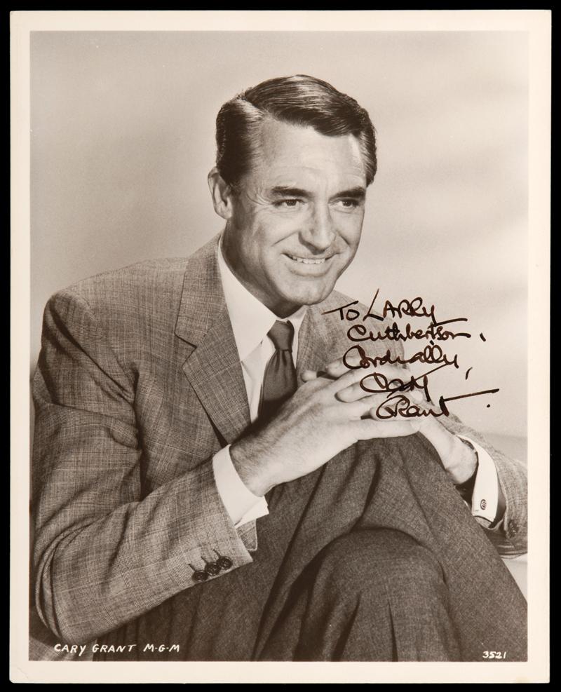 Signed photo of actor Cary Grant, personalized to ''Larry Cuthbertson, Cordially, Cary Grant'' in black marker. Both signature and condition of black and white 8'' x 10'' photo are excellent. With PSA/DNA COA.