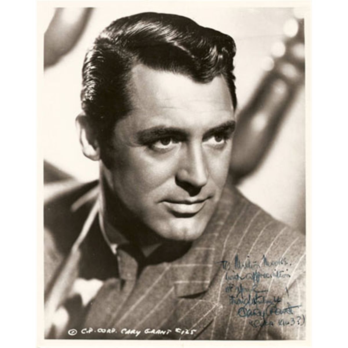 Charismatic legend, Cary Grant signed photo, with inscription reading in full: ''To Milton Moore, with appreciation of your thoughtfulness! Cary Grant (circa 1943?)''. Photo creased across top of Grant's head, though not readily visible. Measures 8'' x 10''. Very good condition.