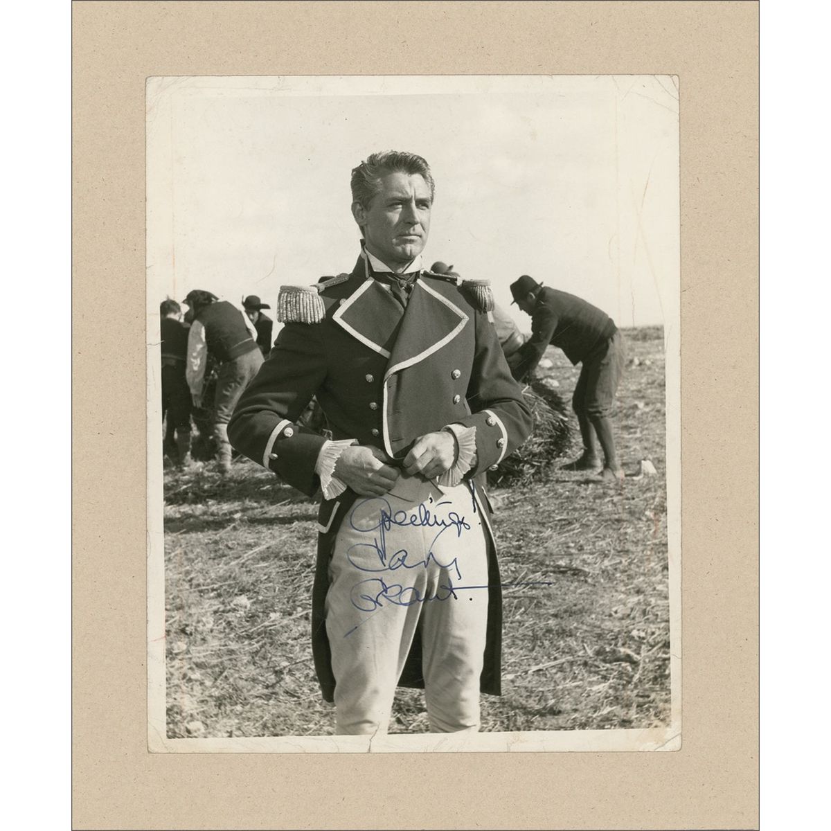 Vintage glossy photo of Cary Grant from ''The Pride and the Passion,'' signed in fountain pen, ''Greetings, Cary Grant''. 8'' x 10'' photo is affixed by its top edge to a 10.5'' x 12.5'' piece of heavy cardstock. In very good condition, with scattered creases and surface marks, heavier at the edges.