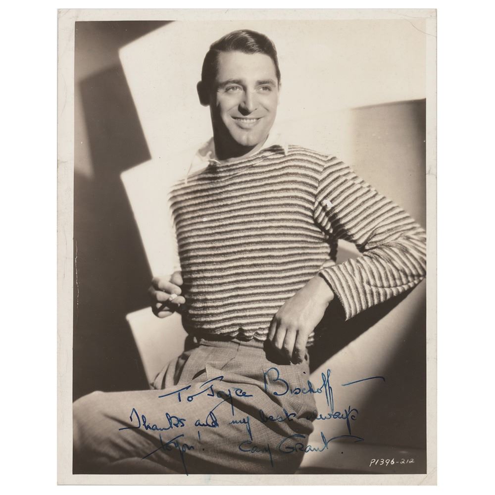 Vintage glossy 8 x 10 studio portrait of Grant smoking a cigarette in a handsome seated pose, signed and inscribed in blue ink, "To Joyce Bischoff—Thanks and my best always to you! Cary Grant.” In very good to fine condition, with creasing along the edges.