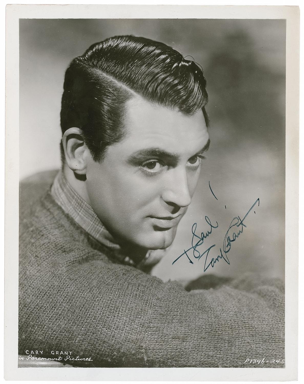 Vintage glossy 8 x 10 Paramount Pictures publicity photo of Grant looking over his shoulder, signed and inscribed in-person in fountain pen “To Saul! Cary Grant.” Scattered creases, surface marks, and impressions, and a bit of irregular ink adhesion to signature, otherwise fine condition. Saul Goodman Collection.