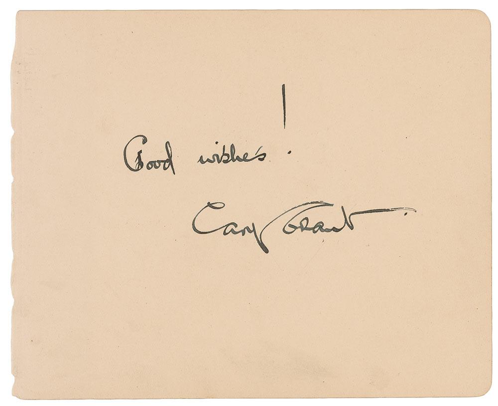 Large and bold vintage fountain pen signature, “Good wishes! Cary Grant,” on an off-white 6.5 x 5.25 album page. In fine condition, with a few light wrinkles.