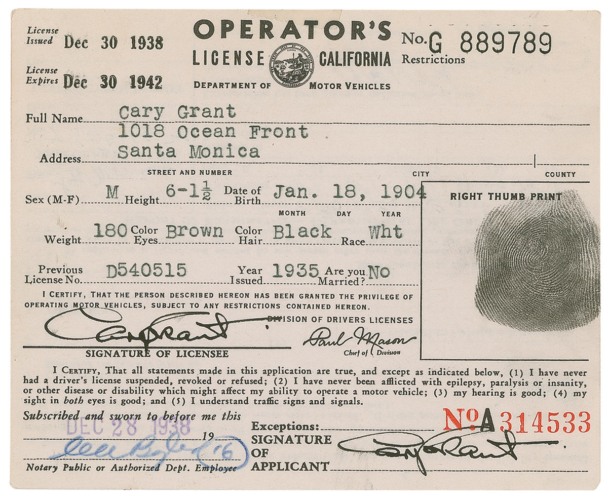 DS, one page both sides, 5 x 4, stamp-dated December 28, 1938. California operator’s license, filled out and signed twice by Grant. Grant’s personal information is filled out in type, including his birthdate, address, and physical characteristics, signing twice in black ink as the licensee and again as the applicant. License also bears a large right thumbprint of Grant, with reverse bearing pencil notations regarding his eye exam as well as the results of his law and driving exam. In fine condition. A very personal, one-of-a-kind item from one of classic Hollywood’s leading men, who was quite busy in 1938 making Bringing Up Baby and Holiday, alongside Katharine Hepburn.