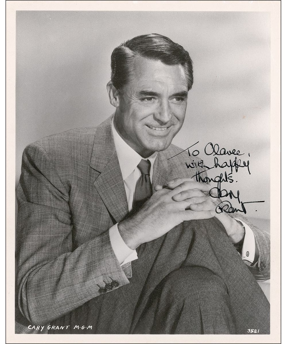 Handsome vintage matte-finish 8 x 10 photo of Grant sitting with his legs crossed, signed and inscribed in fountain pen “To Olavee, with happy thoughts. Cary Grant.” In fine condition, with a few scattered light creases and a couple trivial spots to background.