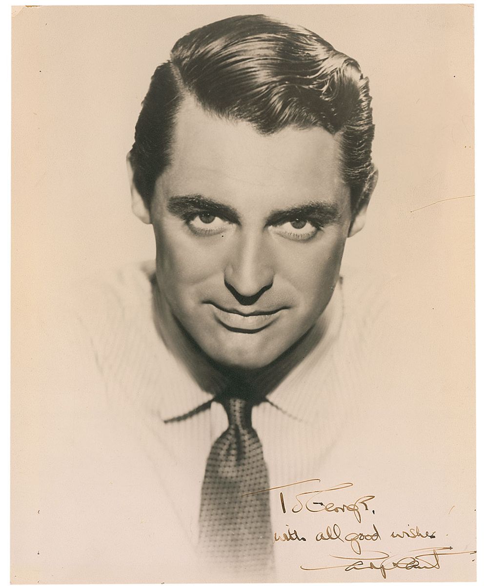 Stunningly handsome vintage matte-finish 9 x 11 head-and-shoulders photo of Grant in a striped shirt and tie, signed and inscribed to assistant director George Rhein in fountain pen “To George, with all good wishes, Cary Grant.” In fine condition, with slightly irregularly trimmed edges (with right edge barely touching the very end stroke of signature), insignificant pinholes to bottom left corner and some paper lost to tiny portion of upper left, and tape remnants from scrapbook removal on the reverse.