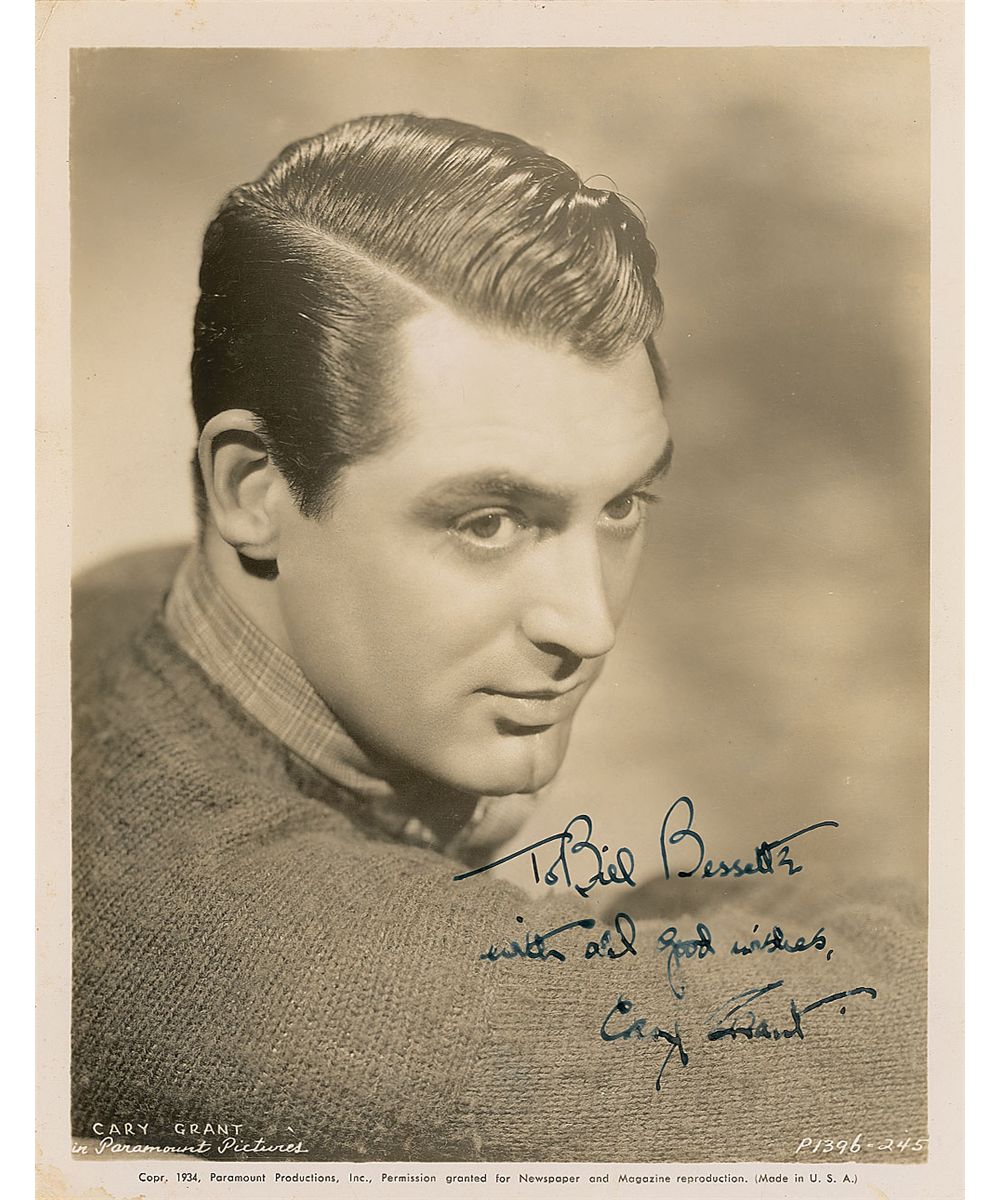 Vintage glossy 8 x 10 Paramount Pictures publicity photo, signed and inscribed in fountain pen, “To Bill Bessette, with all good wishes, Cary Grant.” Some scattered light creases and surface marks and a bit of irregular ink adhesion to portion of signature, otherwise fine condition. Accompanied by a full letter of authenticity from PSA/DNA.
