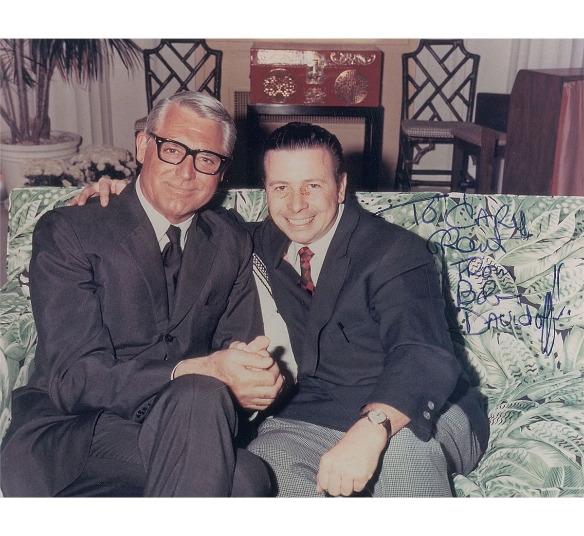 Color satin-finish 10 x 8 photo of Grant sitting on a couch with Palm Beach photographer Bob Davidoff, humorously signed and inscribed in blue felt tip by Grant, “To Cary Grant from Bob Davidoff.” In fine condition.