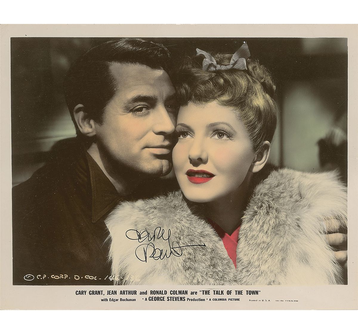Color vintage glossy 10 x 8 publicity photo for The Talk of the Town, boldly signed in fountain pen by Grant on Jean Arthur’s fur coat. In fine condition, with trivial scattered surface marks and two small areas of crazing to finish.