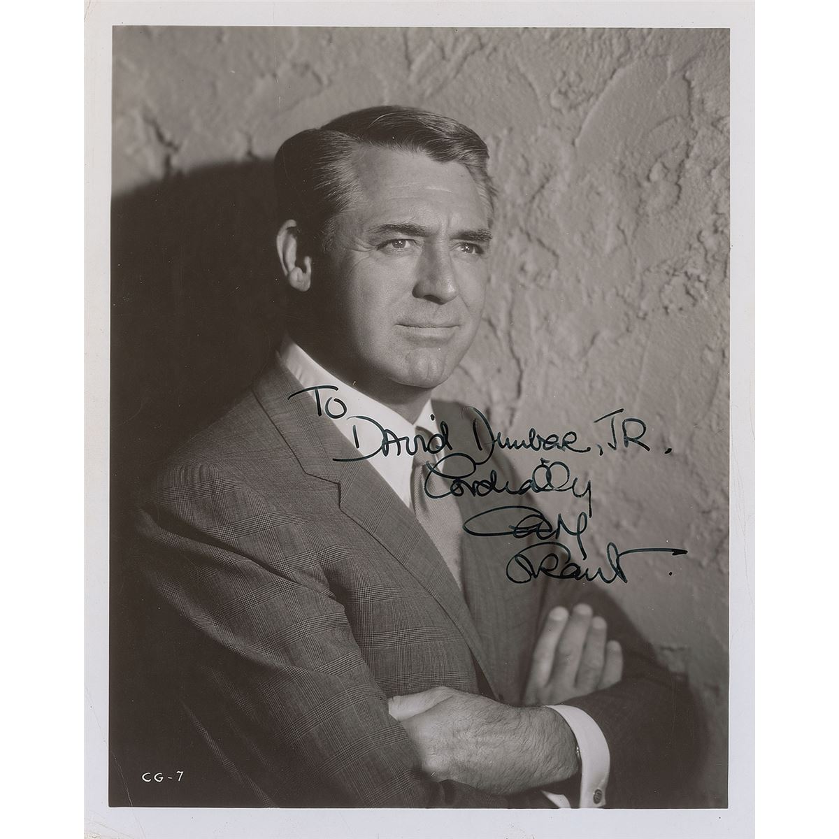 Glossy 8 x 10 photo of Grant with his arms folded, signed and inscribed in black felt tip, “To David Dunbar, Jr., Cordially, Cary Grant.” In very good condition, with scattered creasing and some dings to edges.