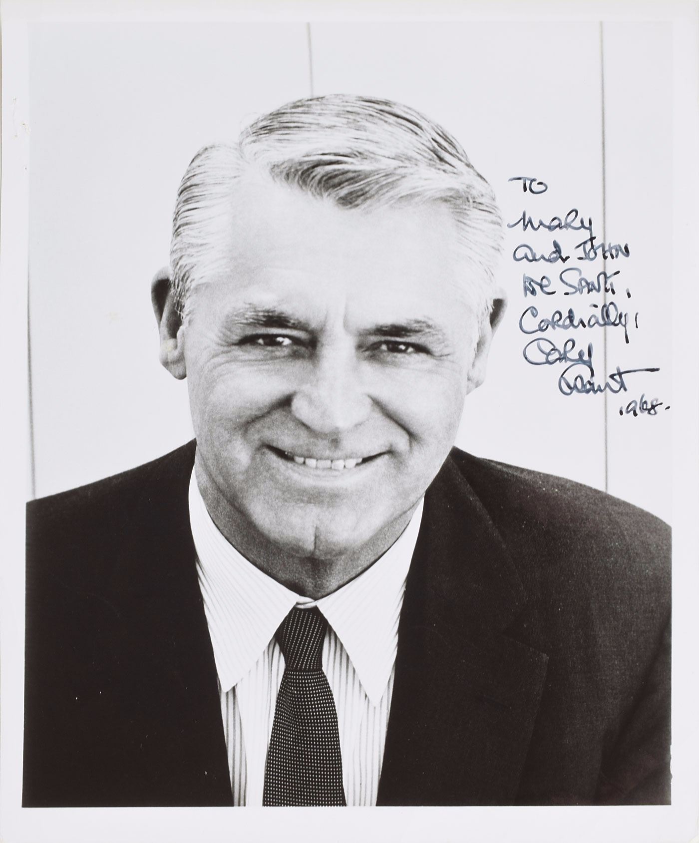 Glossy 8 x 10 head-and-shoulders photo of Grant, signed and inscribed in black ink, "To Mary and John De Sant, Cordially, Cary Grant, 1968.” Reverse bears an affixed caption: "Mr. Cary Grant thought you might be pleased to receive this personally signed photograph: it comes to you with sincere appreciation of your kind message during his recent hospitalization." In fine condition, with a few surface impressions and pin holes to upper left border, which could be easily matted out. On March 12, 1968, Grant was involved in a car accident on Long Island when a truck struck the side of his limousine. He was hospitalized for 17 days with three broken ribs.
