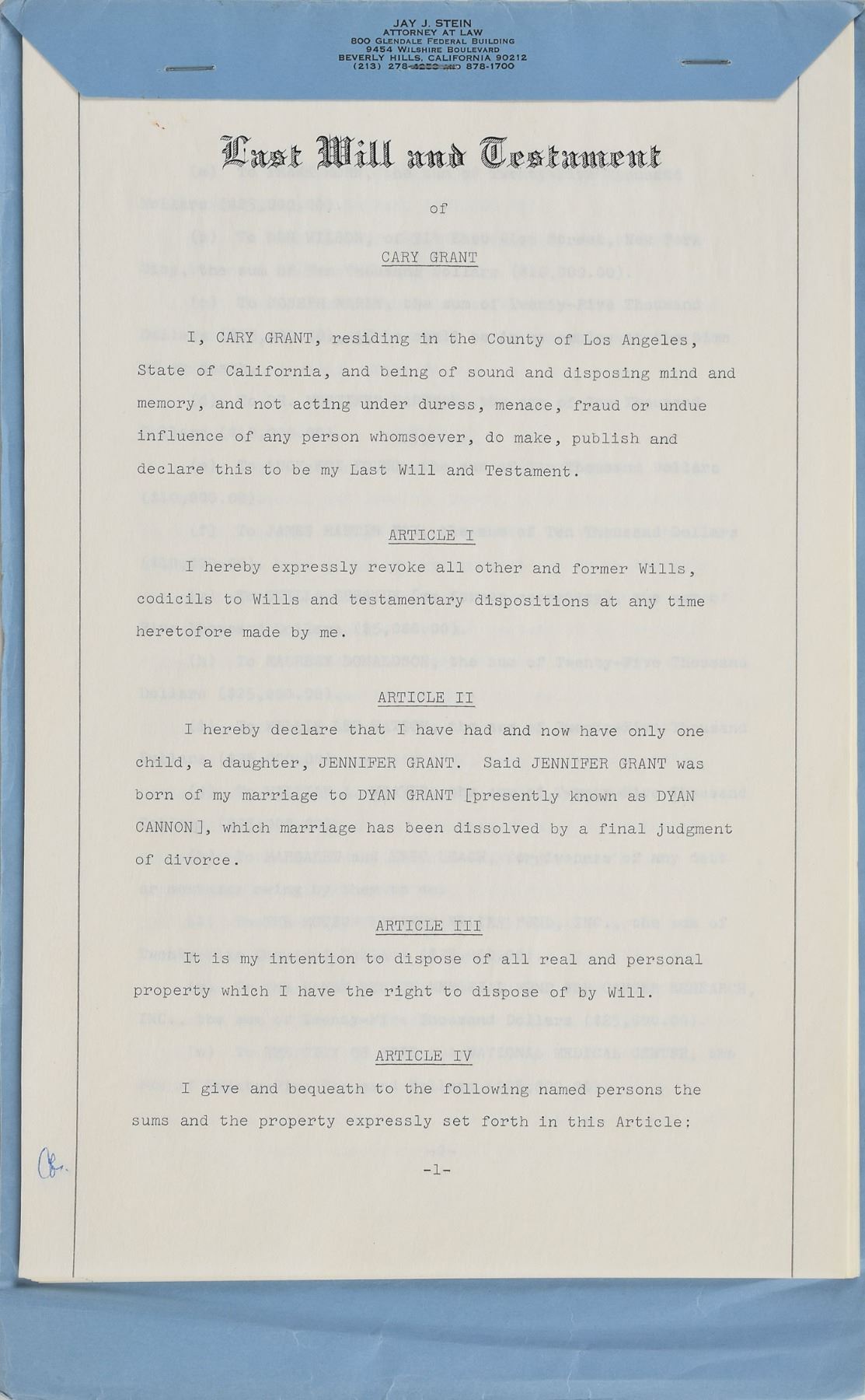 DS, fifteen pages, 8.5 x 13, September 24, 1974. Grant's last will and testament, in part: "I, Cary Grant, residing in the County of Los Angeles, State of California, and being of sound and disposing mind and memory, and not acting under duress, menace, fraud or undue influence of any person whomsoever, do make, publish and declare this to be my Last Will and Testament." In article IV, Grant gives and bequeaths monies ranging from $10,000 to $25,000, or relinquishes debt, to a list of sixteen individuals, couples, and/or institutions. In Article V, Grant gives and bequeaths "all of my automobiles, wearing apparel, ornaments and jewelry…to Stanley E. Fox [who]…shall distribute certain of my personal effects…in his sole judgment" to a list of friends and his only child, Jennifer Grant. Additional articles relate to Grant's trust estate and its various distributions to his daughter and cousins Margaret and Eric Leach. Signed and dated at the conclusion in blue ballpoint by Grant, who likewise adds initials to every preceding page, and to any and all emendations found therein. In fine condition.