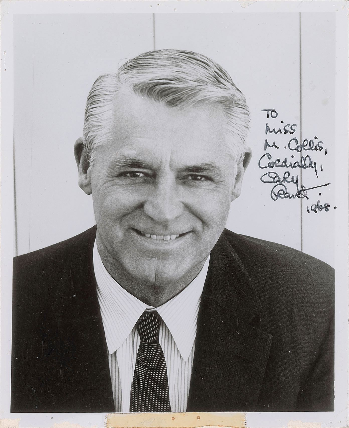 Vintage glossy 8 x 10 close-up photo of Grant smiling into the camera, signed and inscribed in fountain pen, "To Miss M. Collis, Cordially, Cary Grant, 1968.” In very good condition, with scattered light creasing, and staple holes, tack holes, slight surface loss, and old tape to the borders.