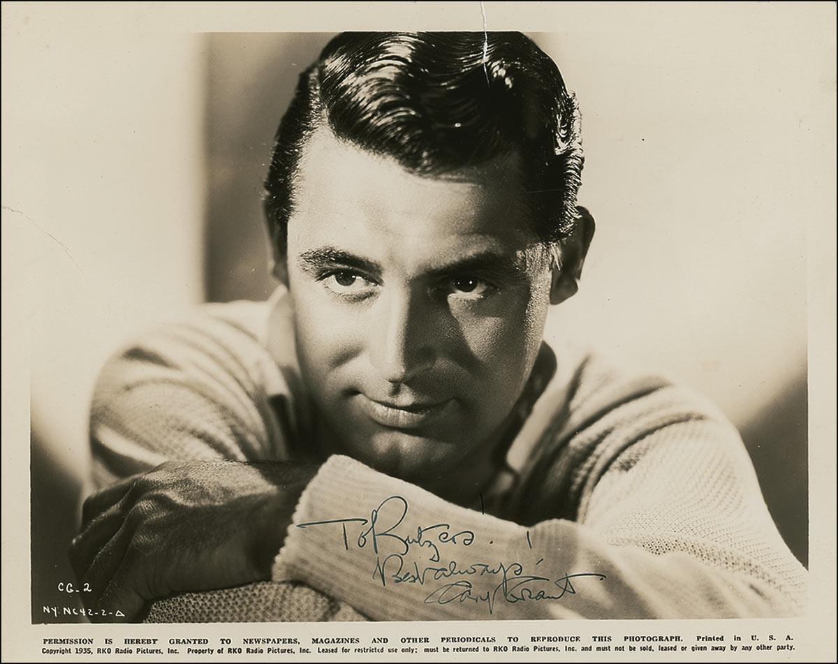 Vintage sepia glossy 10 x 8 publicity photo, signed and inscribed in blue fountain pen, “To Rutzers, Best Always! Cary Grant.” In very good condition, with scattered creasing (a few passing across his face; heavier creasing near left edge), a few scratches to the emulsion, and a tear at the top edge touching his hair. Pre-certified PSA/DNA and RRAuction COA.