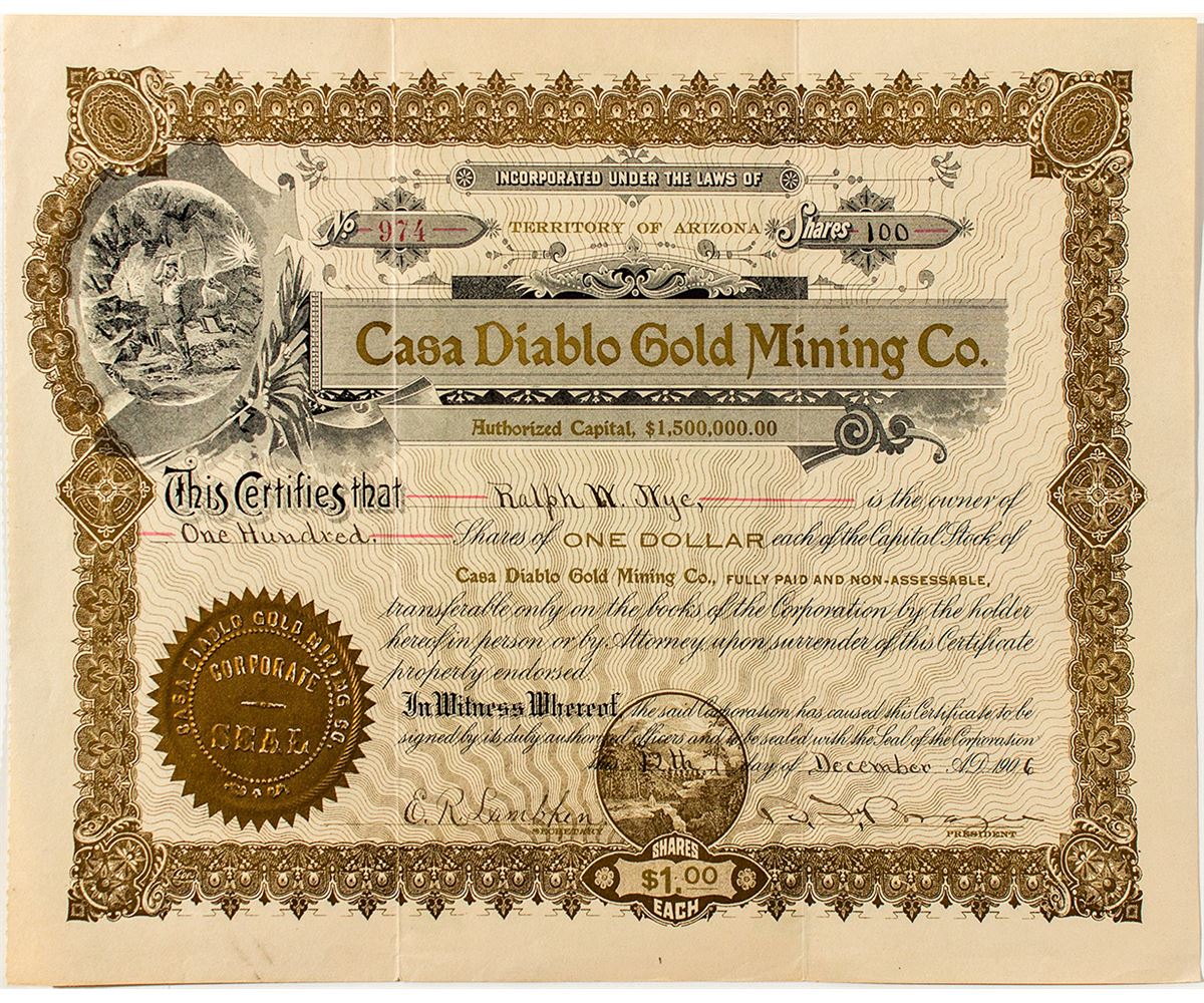 Rare Mono County certificate. Issued to Ralph W Nye for 100 shares of the Casa Diablo Gold Mining Co.