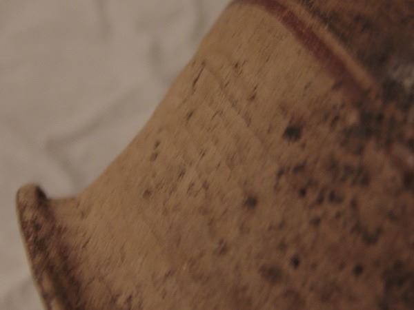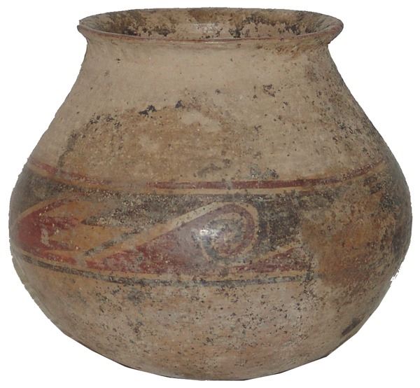 Prehistoric 5-1/2" x 7-1/2" Beautiful, polychrome pottery olla with avian forms, scrolled band, flared rim, and rare corrugated neck. Very good condition, 1 rim chip.