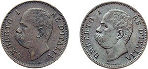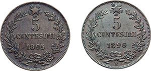 Casa Savoia - Regno di Sardegna - Regno di Italia. Regno di Italia. Umberto I (1878-1900). 5 centesimi 1895 (SPL+) e 1896 (FDC). Pag.617 e 618. Mont. 65 e 66. AE. RR.