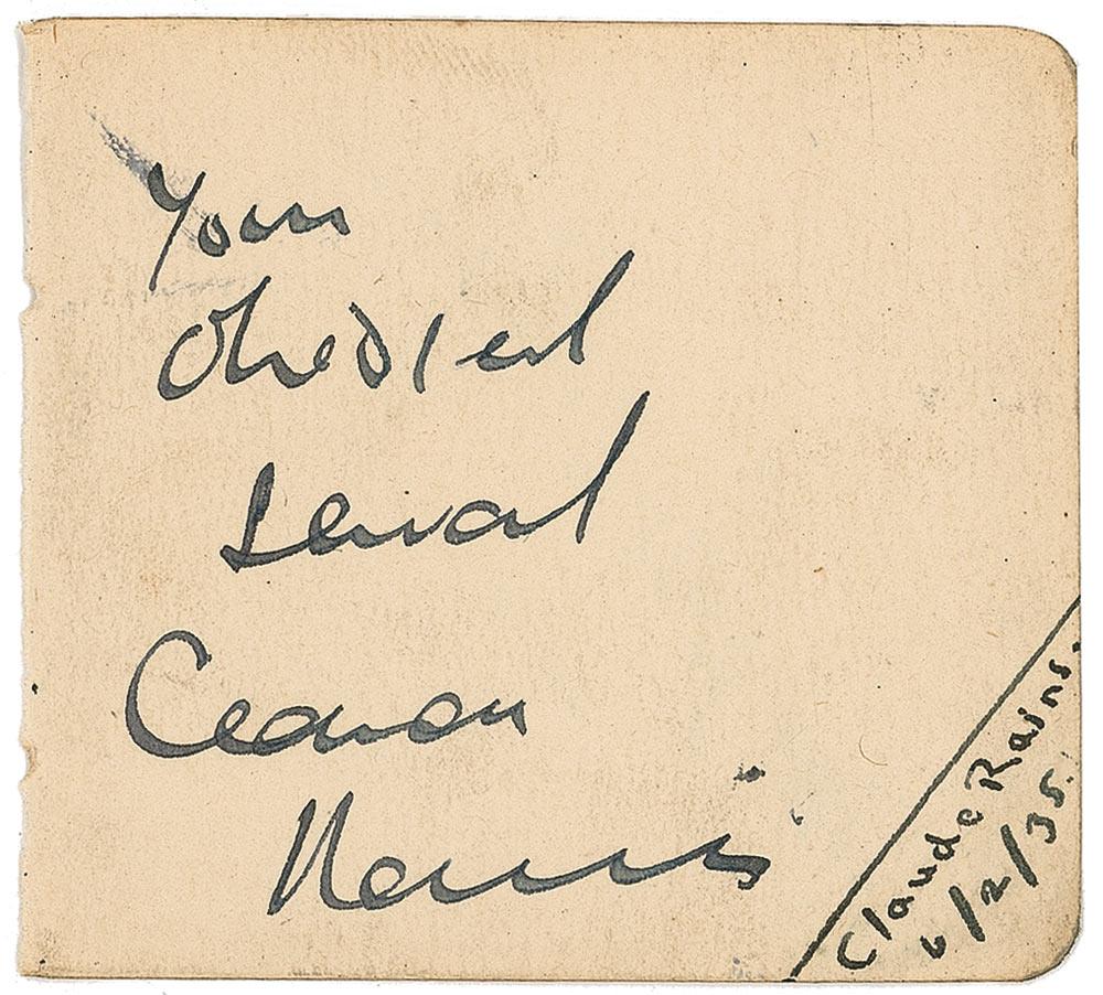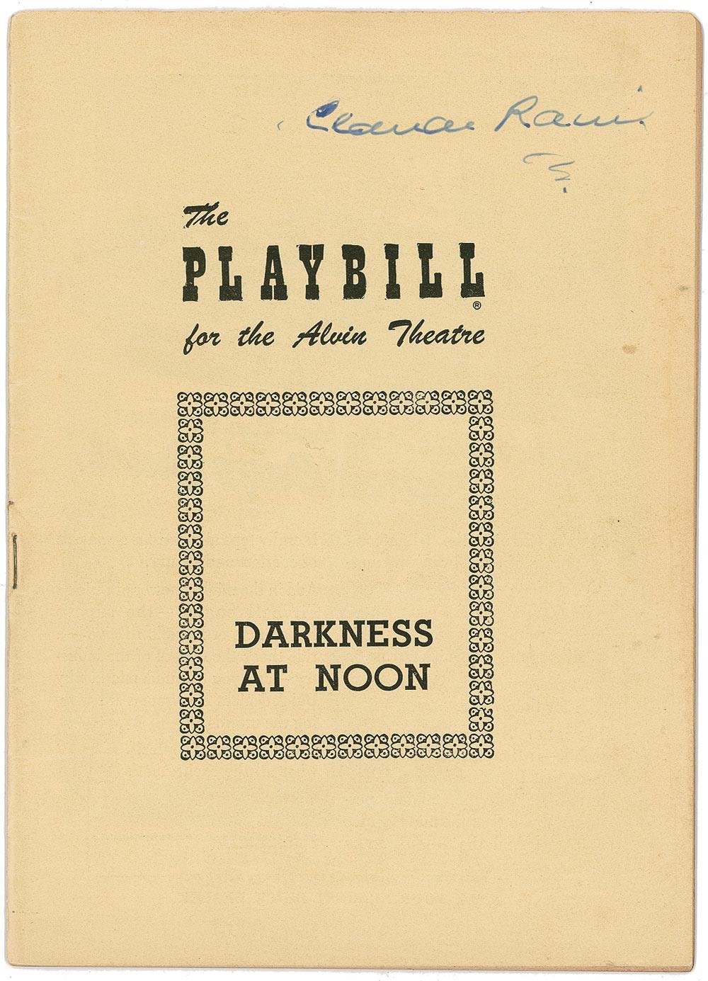 Two items: Playbill from the Alvin Theatre’s 1951 presentation of Darkness at Noon, 6.5 x 9, 32 pages, signed on the front cover in blue fountain pen; and a 2.5 x 2.5 slip signed “Your obedient servant, Claude Rains.” In overall fine condition, with a handwritten collector’s notation at the bottom right corner of the slip.