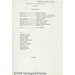<B>Casablanca (Warner Brothers, 1942)</B></I> Script (158 Pages). The American Film Institute calls "Casablanca" the second greatest film of all time. The Academy Award winning script written by Julius J. Epstein, Philip G. Epstein, and Howard Koch, was based on the unproduced stage play, "Everybody Comes to Rick's," written by Murray Bernett and Joan Allison. It's timeless sense of love and danger has made this Best Picture of 1944 a beloved classic in any sense of the word. This bound copy of the script comes from the Jack Warner library and is said to be Mr. Warner's personal copy. Markings on the inside cover show this to be the final revision dated June 1, 1942. There are the words, Col. Warner, handwritten in pencil in the upper left hand corner of the inside front soft cover. Revision pages are all dated and the final page sports a cast and crew list complete with phone numbers and addresses including Humphrey Bogart, Ingrid Bergman, and Peter Lorre. Binding and outer hard cover is in near perfect condition. The inside bound soft cover shows some curling and tears along the edges. Pages of the script are near mint. Very Fine+.