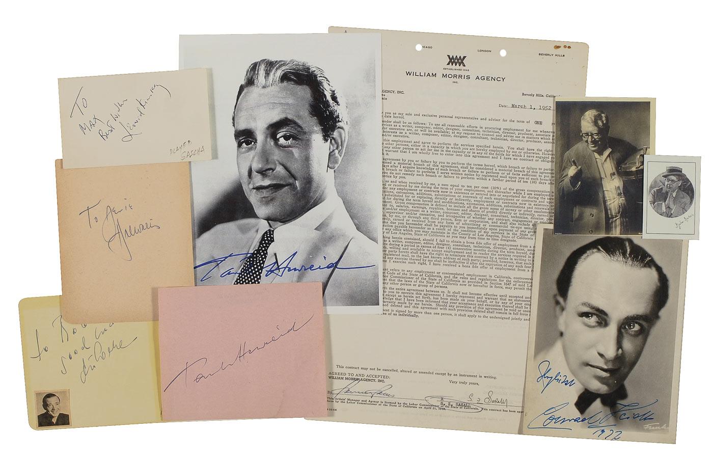 Seven items: four vintage fountain pen signatures of Peter Lorre (ins. with Ray Milland signing on reverse), Paul Henreid, Leonid Kinskey (ins), Hal Wallis (ins), on individual cards or album pages; 6.75 x 9.25 photo signed by Paul Henreid; 5 x 7 photo signed by Conrad Veidt; and a DS, one page, William Morris Agency letterhead, 1952, signed in ink on the front and back by S. Z. Sakall. In overall very good to fine condition.