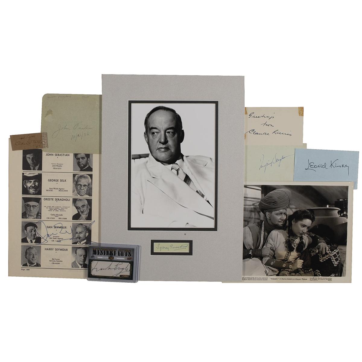 Nine items: vintage ink signatures on individual album pages or slips of Sidney Greenstreet (matted with a photo to an overall size of 11 x 16), Claude Rains (adding “Greetings from”), Ingrid Bergman, Leonid Kinskey (adding “4-21-92”), John Qualen (in pencil, adding “10/12/36”), Charles LaTorre, and Frank Puglia (as part of a Upper Deck ‘Mystery Cuts’ card); Dan Seymour on a program page; and a 10 x 8 glossy photo signed and inscribed by Joy Page. In overall very good to fine condition.
