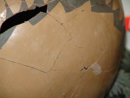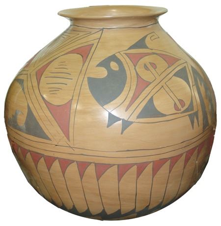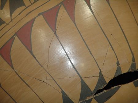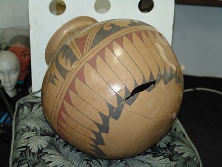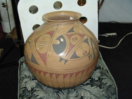 Late 1900s, Extra large thin-walled polychrome pottery jar with popular feather motif. Fair condition, bottom was broken and repaired. 17" x 15"