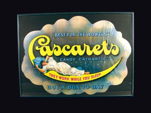 Cascarrets Die Cut Paper Sign, NOS. Shows fold creased otherwise excellent condition. Framed under glass. 41 X 30 inches.