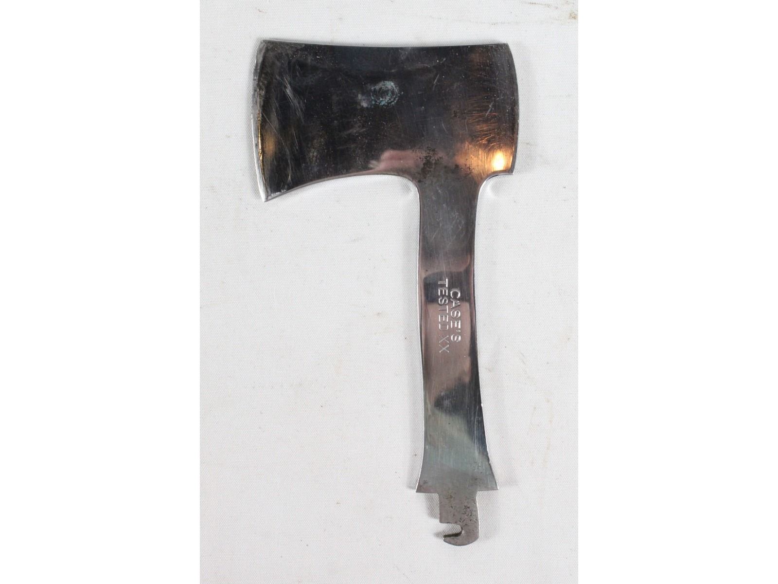 Ax head and knife combo. Knife blade can be switched to an ax. Knife handle has a folding ruler along the side. Blades show usage but are in good condition. Sheath is worn. Ax head and case have the markings "Case Tested XX" engraved. Made between 1932-1940. See photos.