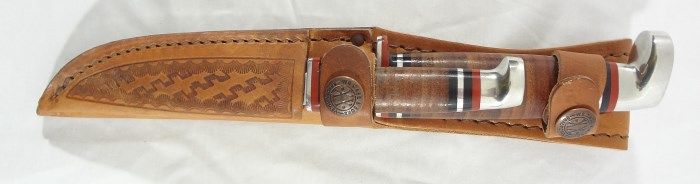 Case Cutlery TWIN FINN Hunter Two Knife Set - New in box. Stainless steel fixed blades. Genuine leather handles. Tru-sharp surgical steel blades. 3 1/8 inch mirror polished concave ground clip blade and 5 inch mirror polished concave ground clip blade with sheath that holds both knives. EST: $150-$160
