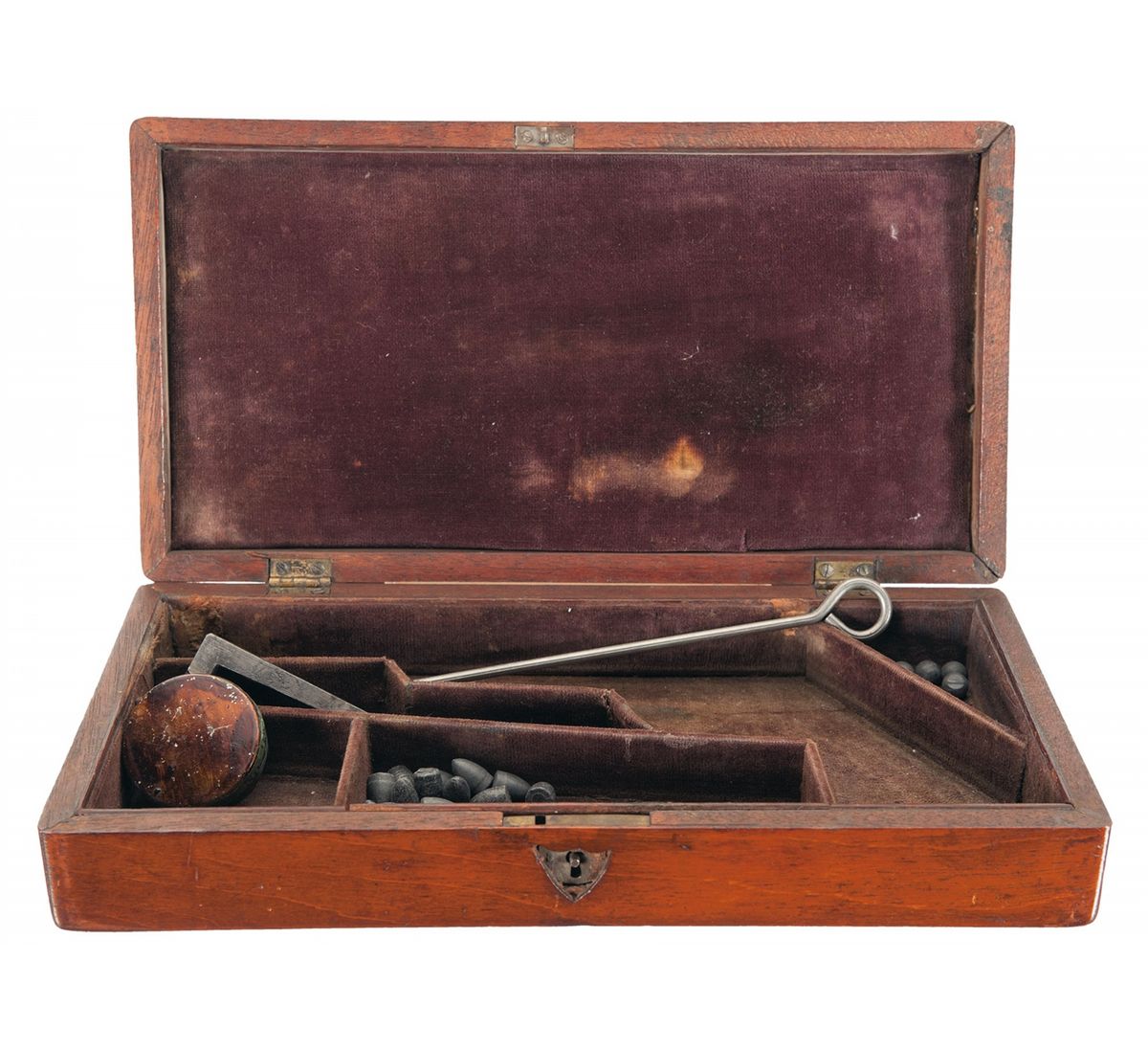 Measuring 10 3/4 inches wide, 5 3/4 inches deep and 1 3/4 inches tall, this mahogany case is configured to accept an 1849 Pocket Revolver with a five inch long barrel. The exterior is unmarked, with a space for a shield escution for the lock, and brass hinges. American style interior, with deep purple velvet lining and 5 compartments. Contained within the case are a number of lead bullets, "L" shaped screwdriver/nipple wrench, 6 1/2 inch long cleaning rod, functional key and an unsealed Eley Brothers lacquered cap tin.