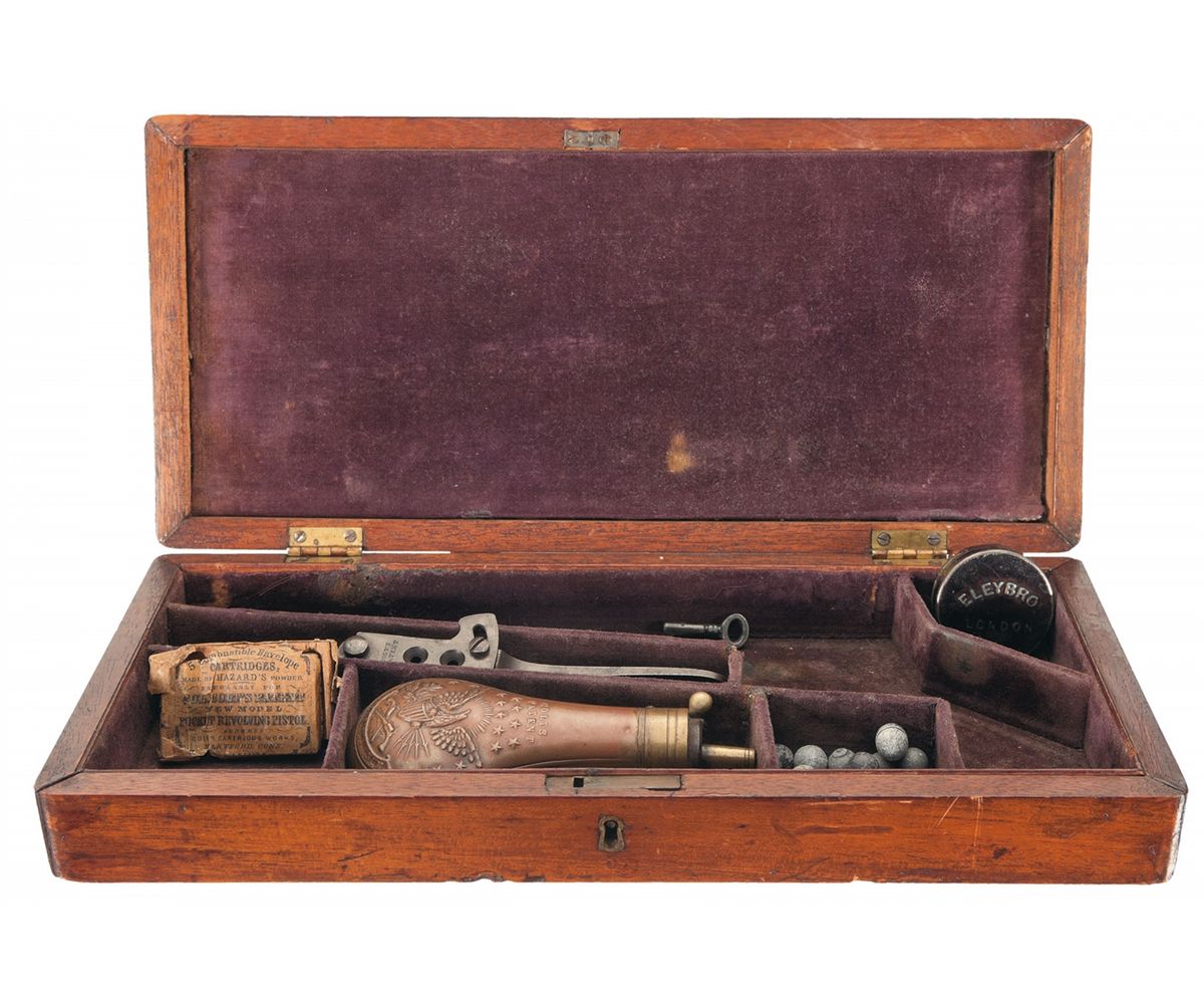 Measuring 12 5/8 inches wide, 5 3/4 inches deep and 1 3/4 inches tall, this case is configured to accept an 1862 Police Revolver with a 6 1/2 inch barrel. The exterior is unmarked, proper for a Colt case, with thin brass lock escutcheon and brass hinges. American-style interior, with a deep purple lining, subdivided into 6 compartments. Included with the case is an Eley Brothers cap tin, a two chamber blued steel mold with "COLTS/PATENT" sprue cutter, assorted bullets, an empty package of Colt/Hazard combustible cartridges, a functioning key and a brass powder flask with Colt "eagle and shield" motif on one side.