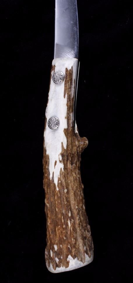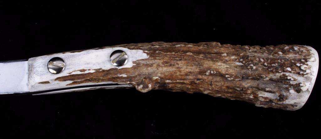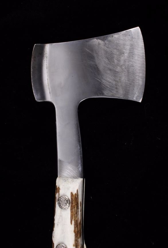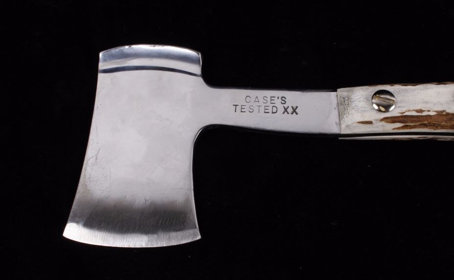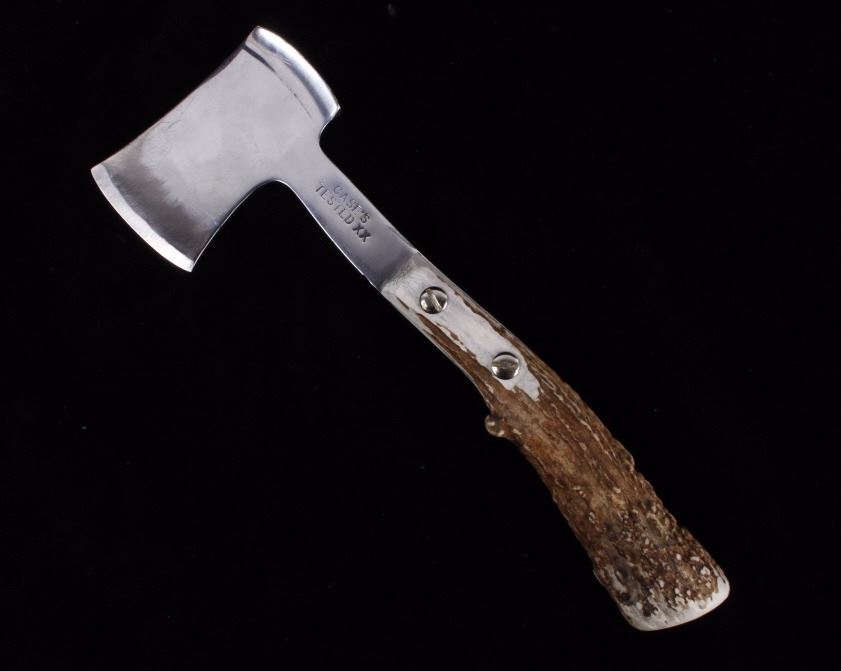 This lot features a Case tested XX Hatchet with elk horn handle. The blade itself shows little wear and is marked Case's Tested XX. The overall condition is good for its age. Measures: 3 13/16" W x 11 3/8" L