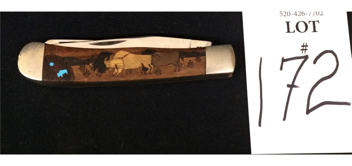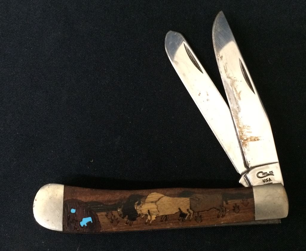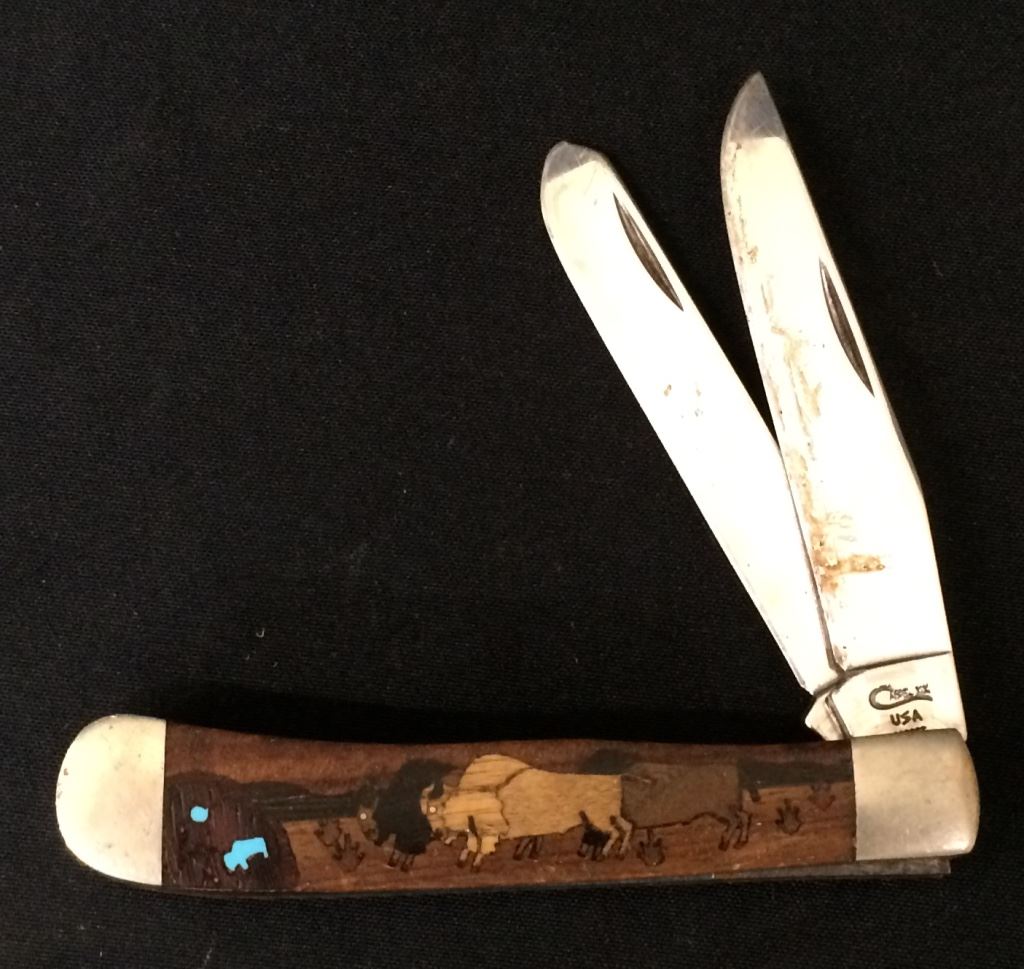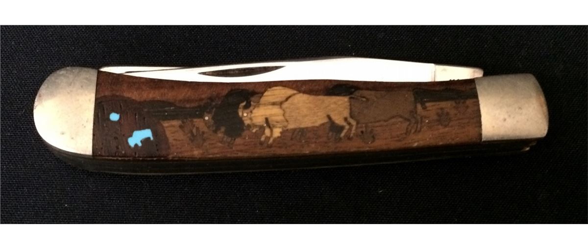 This Case pocket knife has a custom wood / turquoise inlay handle on one side with a “buffalo on the plains” scene. Good vintage condition. Shipping: There will be a $5 handling / packaging fee for shipping this lot. The actual cost of postage will be added on top of that.
