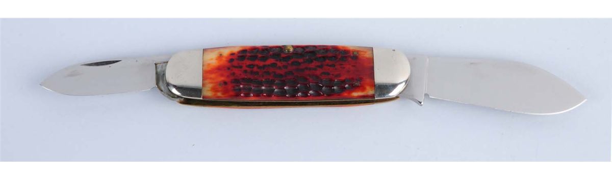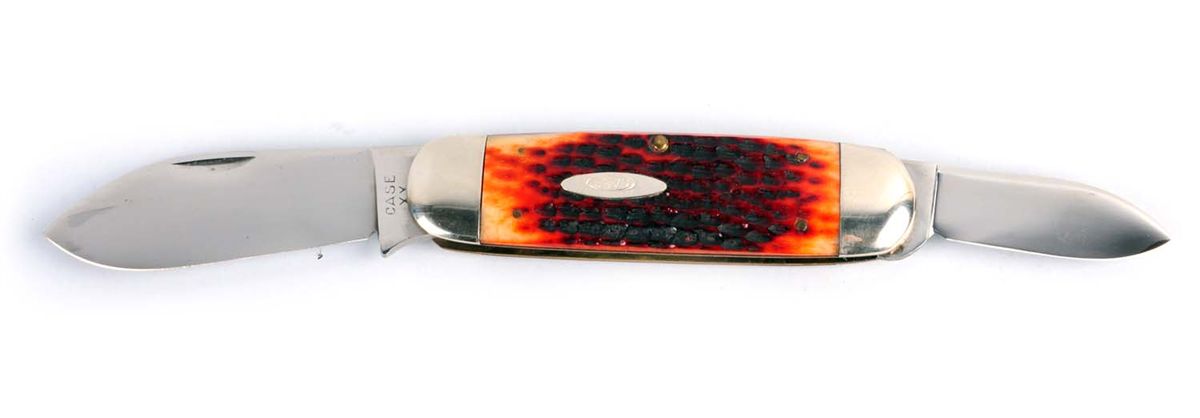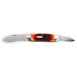 Case XX 4 - 3/8" No. 6250 two-blade "Sunfish" handled in red bone. Back scale has tiny crack by center pin leading to handle edge. Front scale is fine. Both blades have strong snap in both open and close direction. Condition (Near Mint Plus).