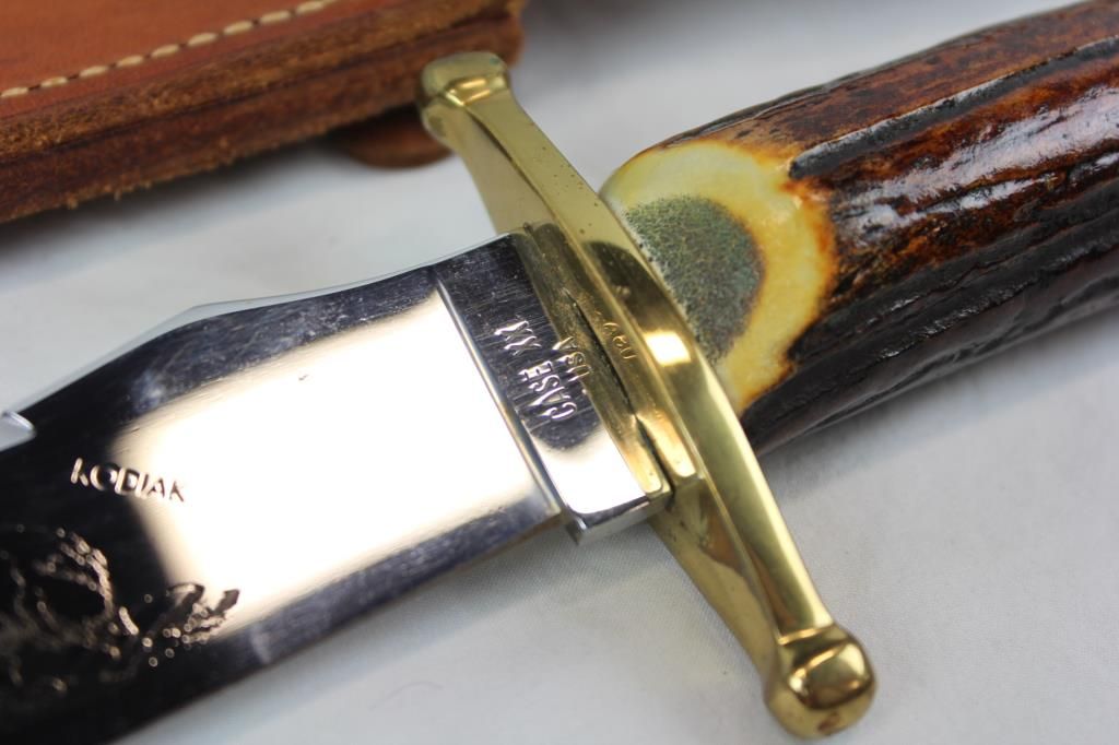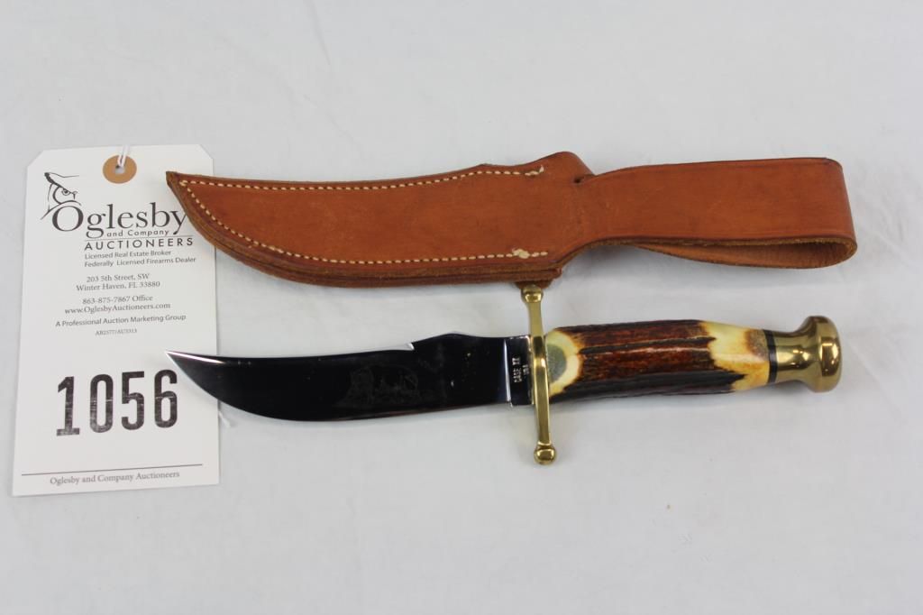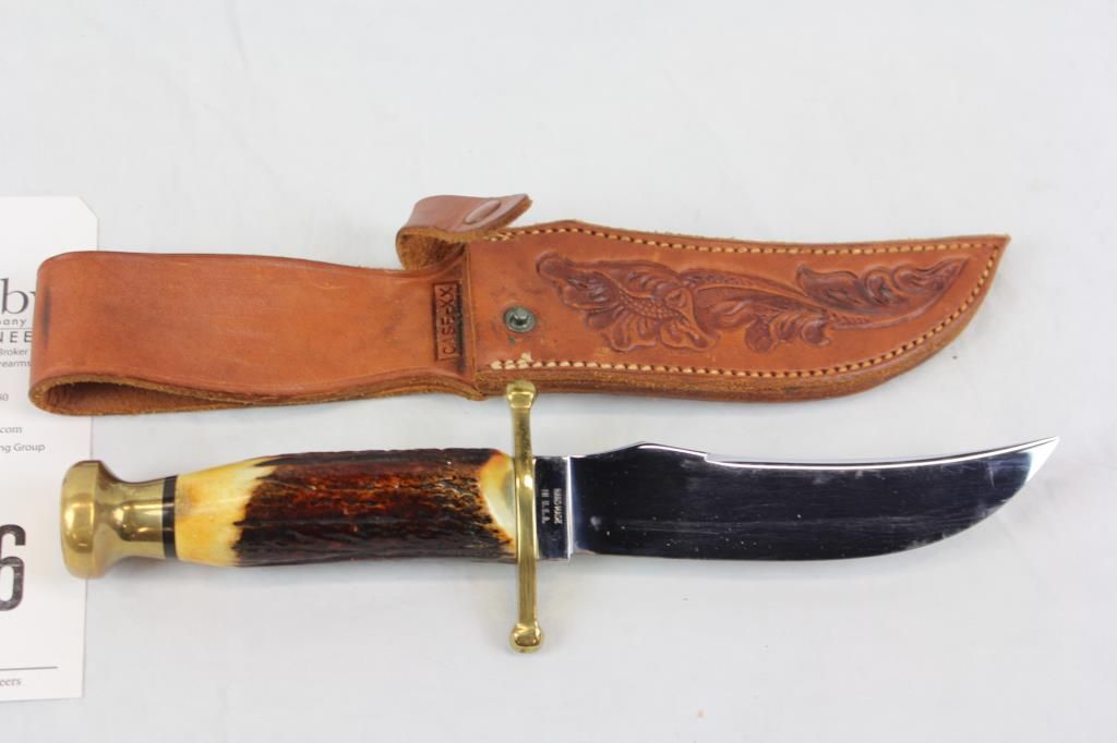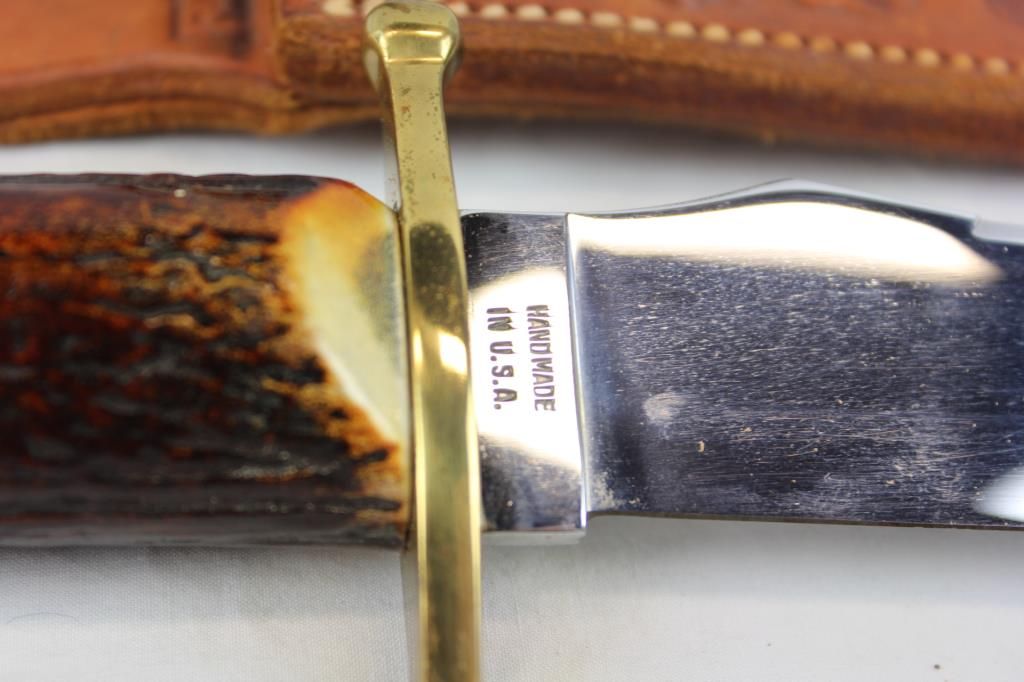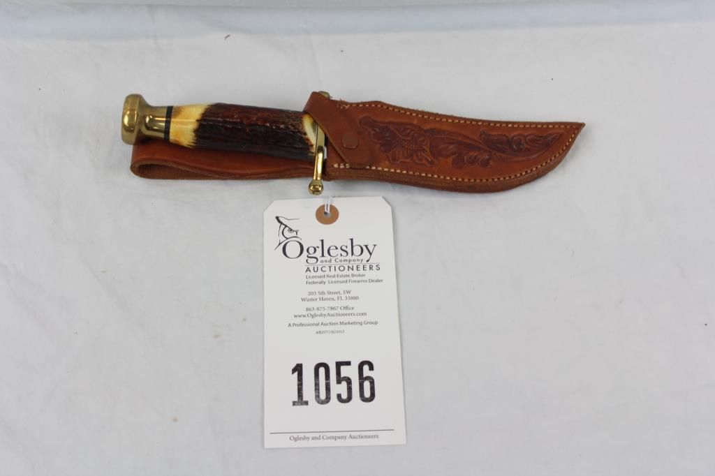 Bowie Type Knife, Brass Handguard and Pommell, Stag Handle, Leather Sheath, Excellent Condition