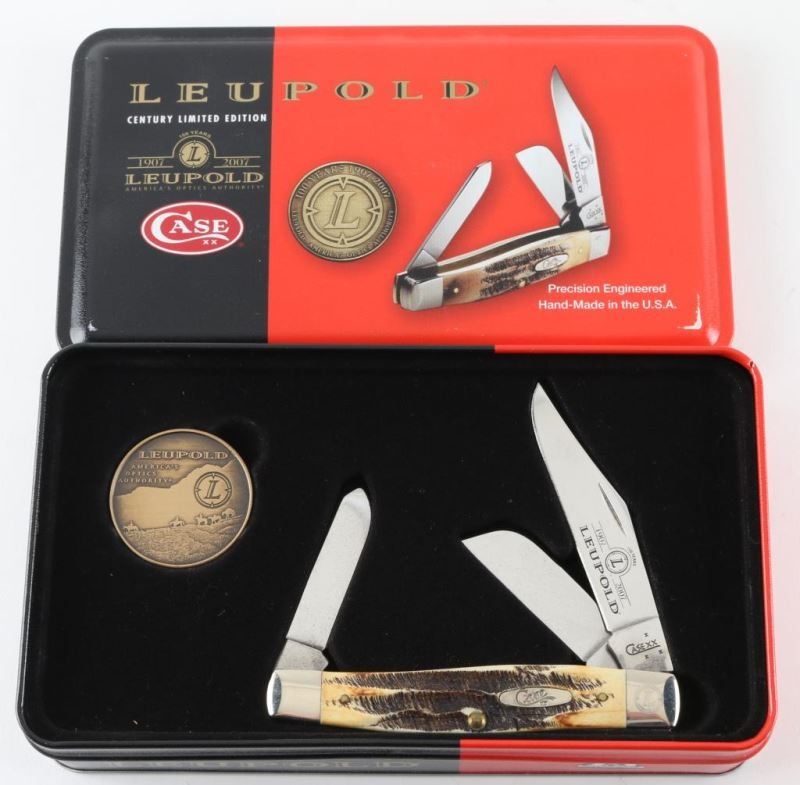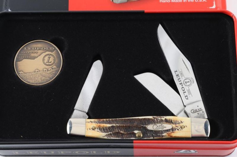 Three bladed folding knife (3.5" clip point, 2.5" sheep's foot, 2.25" drop point) with stag scales in a metal tin. Celebrating 100 years of Leupold. Includes a bronze finished coin. Like new condition, with tiny dent to tin lid.