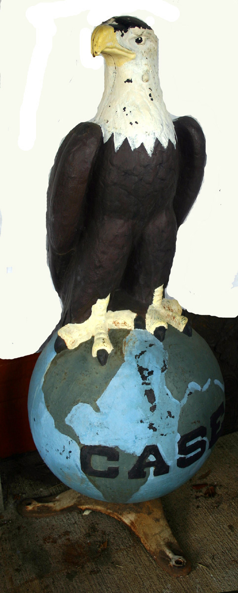 Cast Iron Case Logo Eagle. Stands approx. 58"H on world approx. 24" D. Old, flaking and fading repaint.