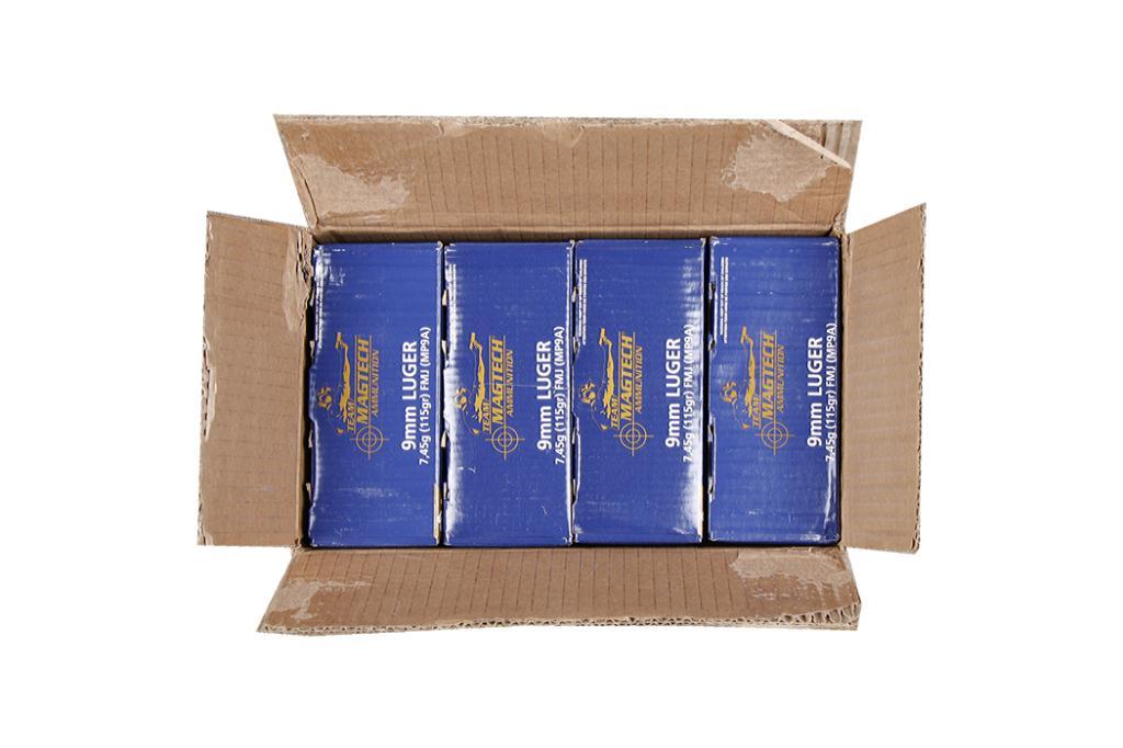 Case Lot of Magtech 9mm Ammo Consists of 4 boxes of 250 rounds each 9mm 115 grain FMC ammo in 50 round trays.Consists of 4 boxes of 250 rounds each 9mm 115 grain FMC ammo in 50 round trays.