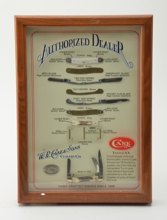 Case & Sons Cutlery Co. Authorized Dealer modern display of the components that go into the making of a Case XX folding knife, issued in 2000, overall fine condition, approx. 18” x 13”, wood and plexiglass. Est.: $150-$300.