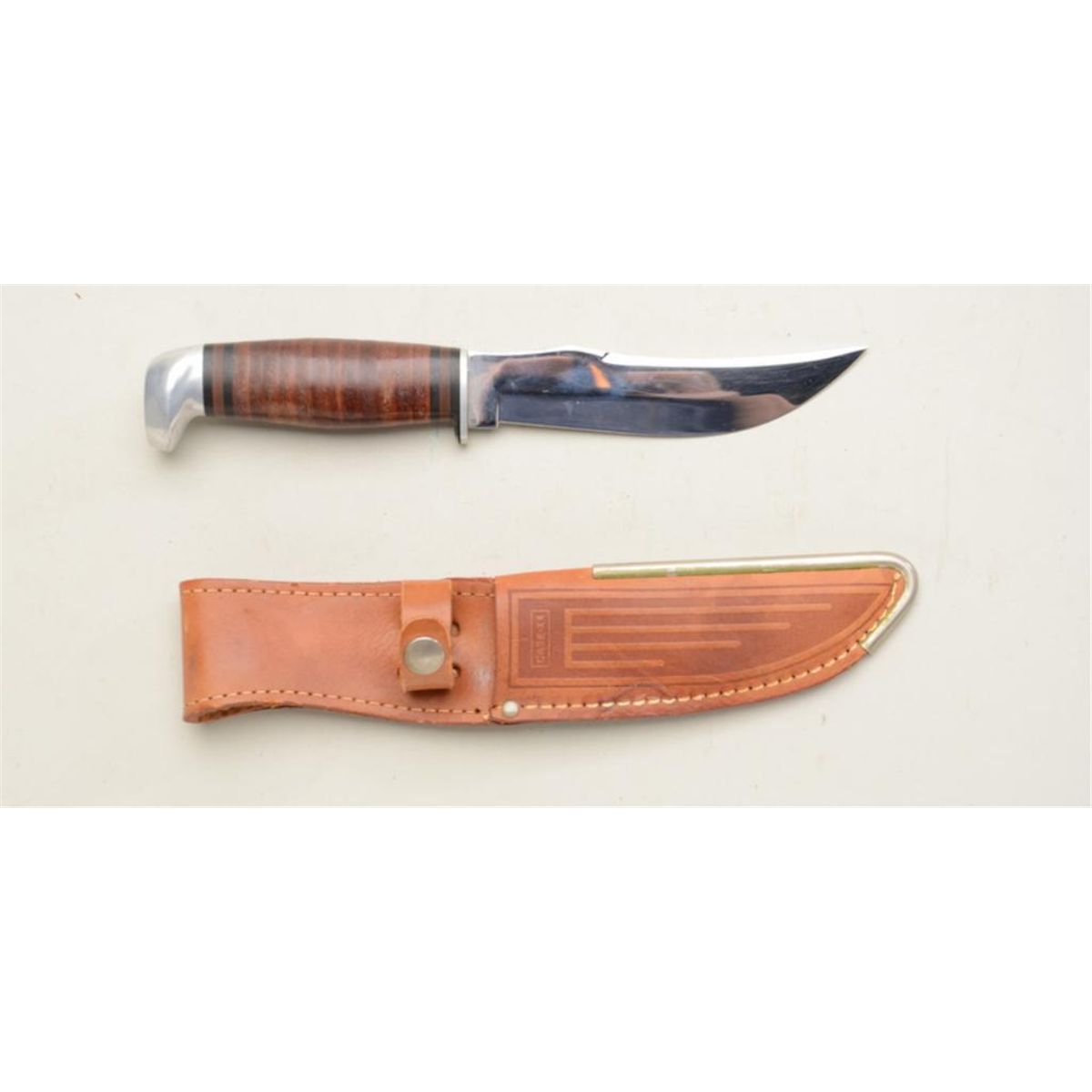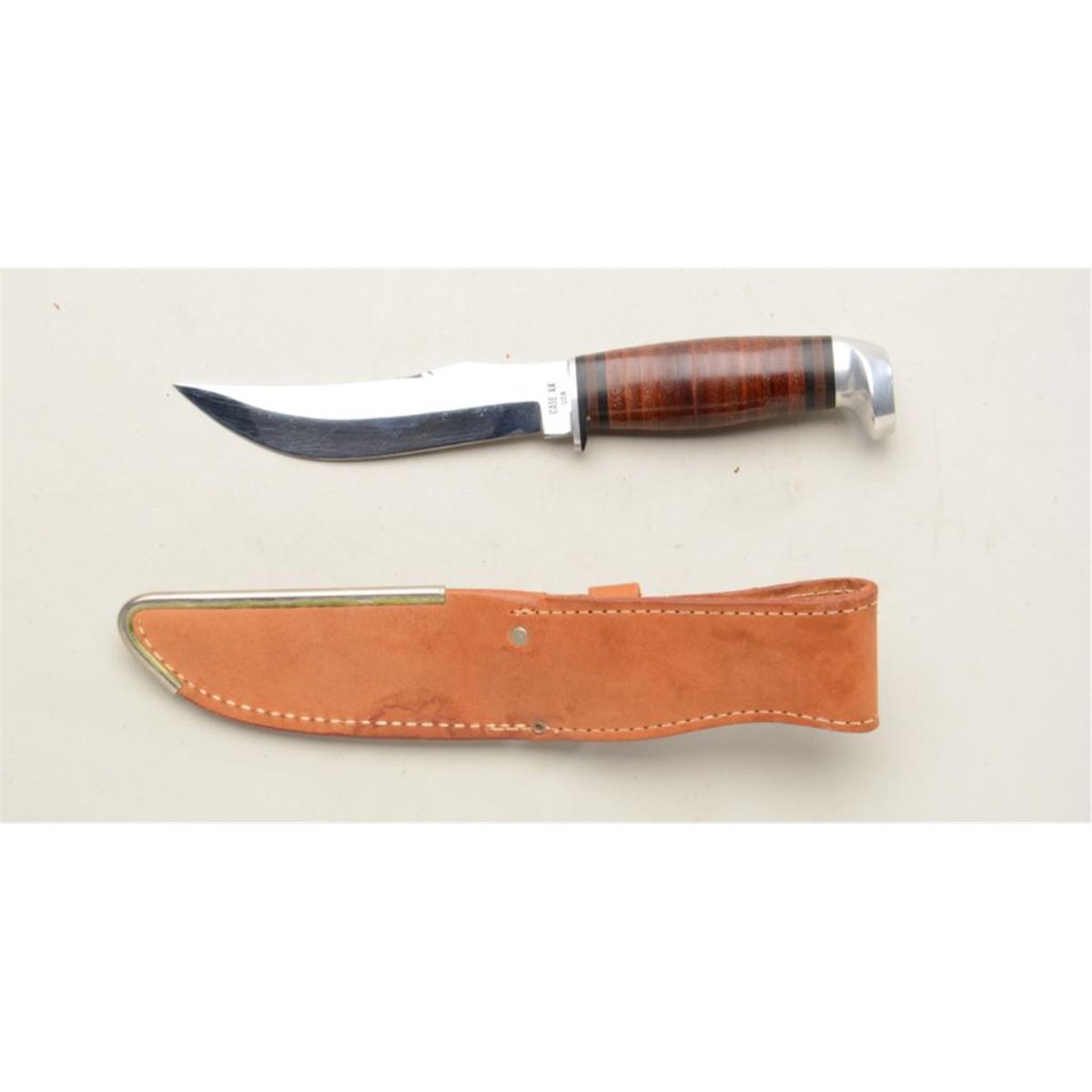 Case XX belt knife in Case XX leather sheath approx. approx. 9” overall with an approx. 5” blade, leather disc stacked grip; the knife and sheath are in overall excellent condition showing little handling. Est.: $100-$200.