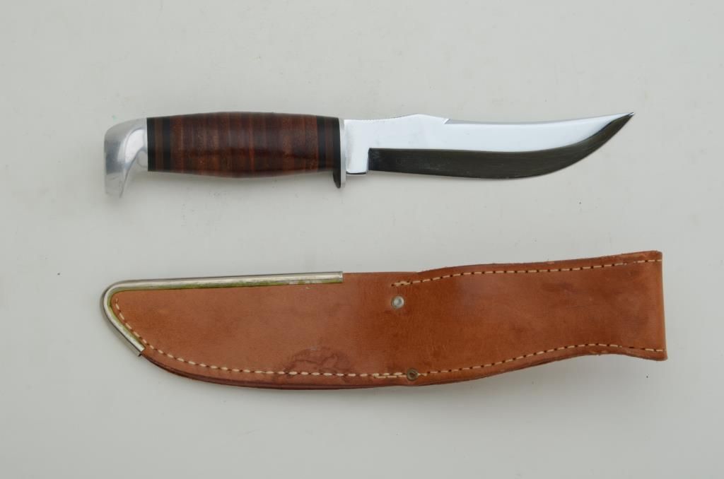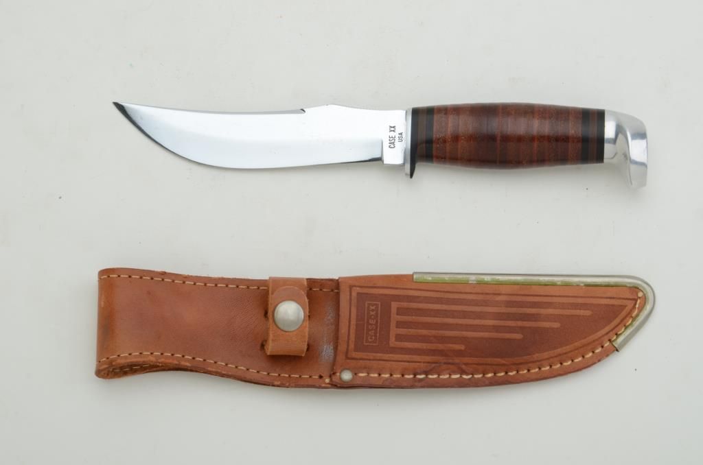 Case XX belt knife in Case XX leather sheath approx. approx. 9” overall with an approx. 5” blade, leather disc stacked grip; the knife and sheath are in overall excellent condition showing little handling. Est.: $100-$200.