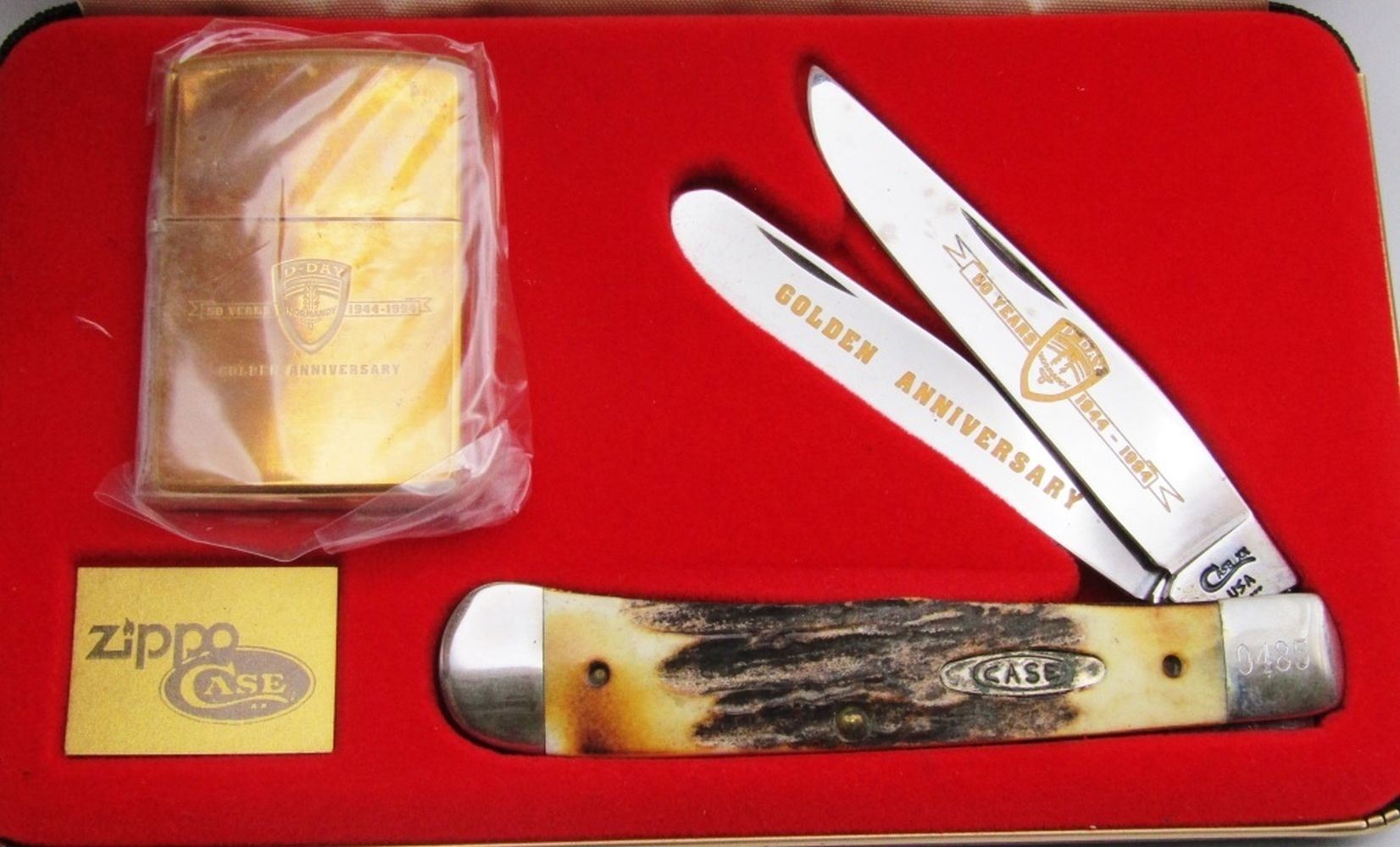 Case Stag Trapper Knife Serial #0485 50th Anniversary Commemorative Knife; Zippo Lighter Solid Brass Windproof Lighter; 50 Year D-Day Normandy 1944-1994 Golden Anniversary! Lighter Zippo Seal still intact!